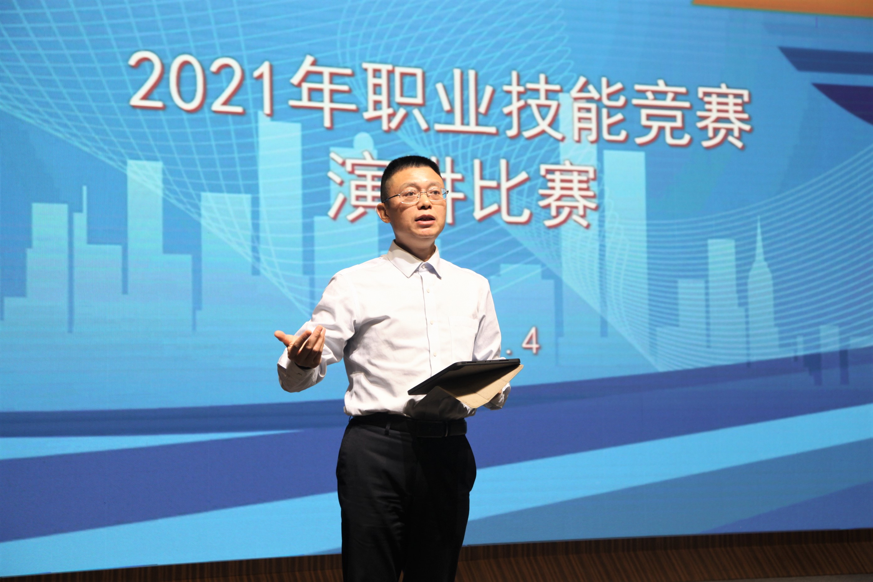 官善友在演講比賽前作動員講話,他希望全體參賽選手以此次競賽為契機,勤學技能、苦練本領、提升素質,不斷弘揚勞模精神、工匠精神;并寄語大家嚴守競賽規(guī)則,賽出水平、賽出風格、賽出風采。